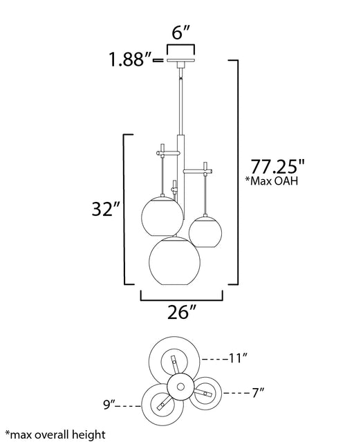 Three sizes of thick Clear glass orbs are suspended displaying a small aluminum sphere encompassed within. Discretely recessed dedicated LED provid...